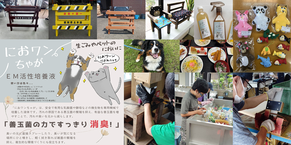 「特定非営利活動法人すまいる」では、椎茸の栽培・梱包・出荷・販売のほか、アルミ鉄の缶、ペットボトルの分別、金属整品の解体、宮崎県産杉材を使って市内で使用する木製バリケードや子供用椅子などの木工製品を作製しています。
